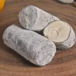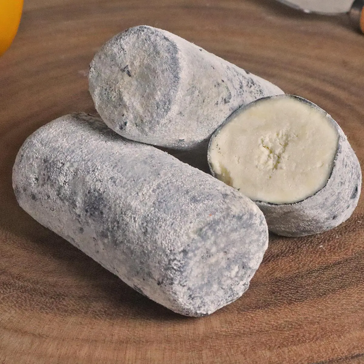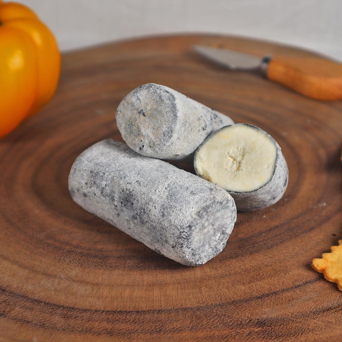 Process – Fresh soft chevre (goat cheese) shaped into logs, coated with charcoal powder and aged